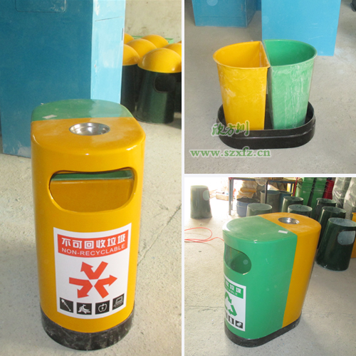 環保分類玻璃鋼垃圾桶 學校的首選深圳寶安沙井實驗學校,是欣方圳老顧客了。按照之前訂購的玻璃鋼垃圾桶樣板生產,發實物照給工廠的廠長確認。A21玻璃鋼環保分類垃圾桶的規格為:680*400*850mm.這款垃圾桶來頭可不小哦,它是獲得了專利外觀設計的玻璃鋼垃圾桶。每個產品是經過的嚴格生產程序制造出來,貼上產品合格證,符合企業高品質標準。玻璃鋼垃圾桶一邊嫩綠,一邊中絡黃,底座黑色,外加一個煙灰缸巧妙的搭配,簡潔、美觀。桶蓋/桶身采用FRP玻璃鋼復合材料制造,具有防腐、防盜、防生銹、易清潔等特點,表面涂層采用高分子耐老化膠衣涂層,色澤明快、持久。