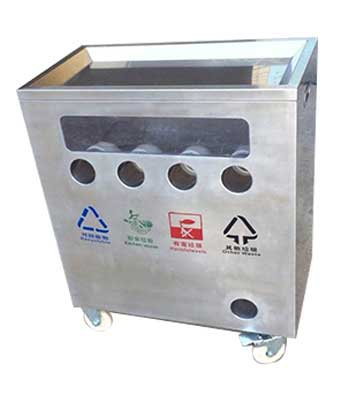 小區垃圾分類站點四類垃圾分類垃圾桶,不銹鋼無疑是較為理想的材質。它戶外防銹蝕效果好,表面金屬光澤高檔美觀,污漬也易清理。不銹鋼分類桶產品款式造型易定制,不受尺寸大小限制,滿足個性化需求,擺放于惠